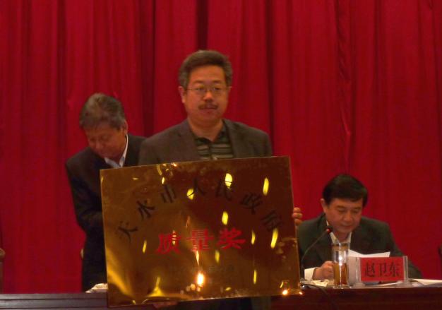 在会上,宣读了天水市人民政府关于表彰2013年度天水市人民政府质量奖获奖企业的决定,天水长开互感器制造有限公司等两户企业获得第一届天水市人民政府质量奖,对获得2013年度天水市人民政府质量奖的企业,天水市政府各奖励20万元。我公司总经理李凡同志上台领奖。